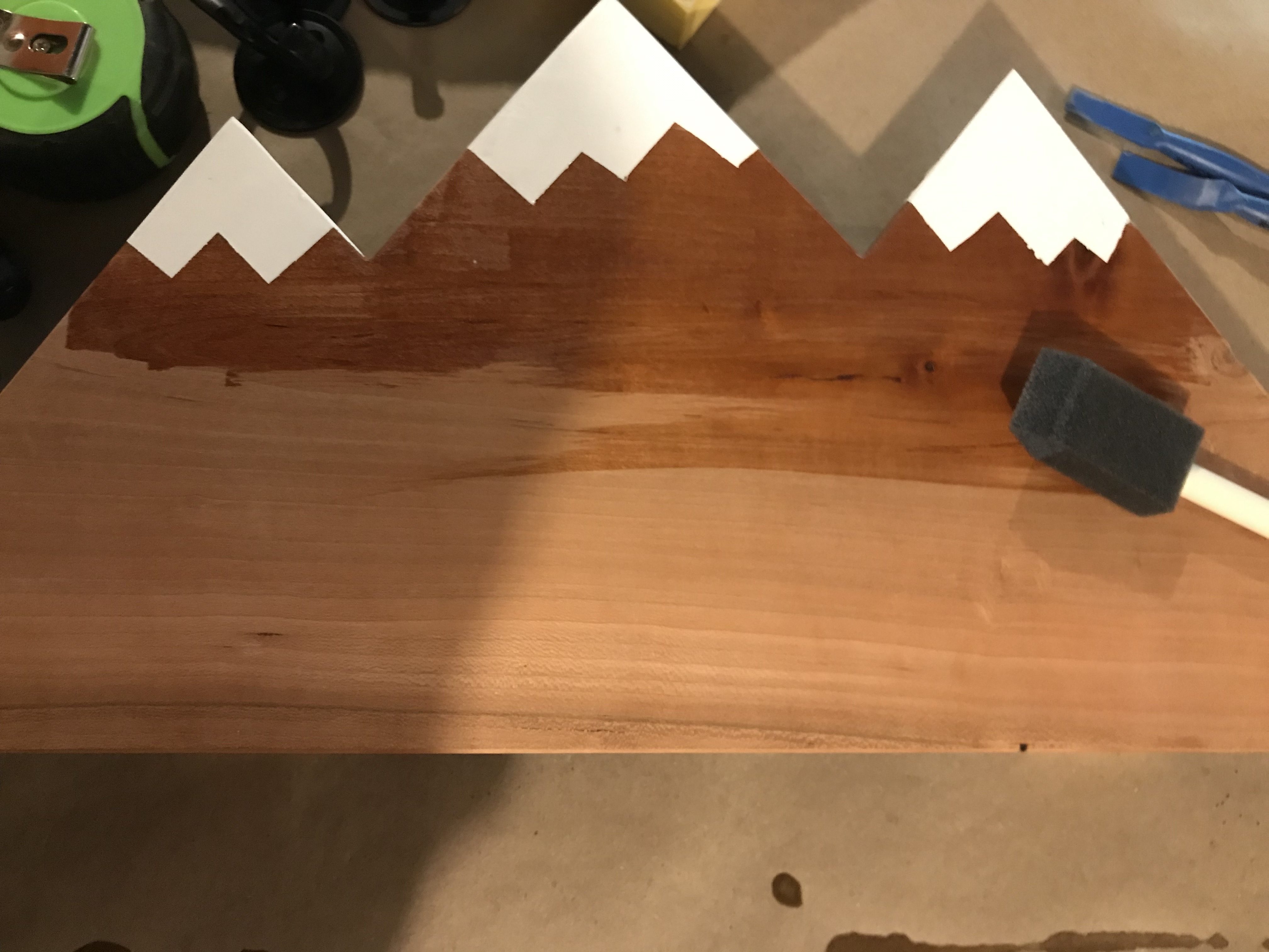 Following that, I used Polycrilic to coat the entire mountain range. I chose Polycrilic because regular polyurethane sometimes leaves a yellowish tint, and I wanted to avoid that. The finish I used was very clear and didn’t change the color of the white snow peaks. It did slightly darken the wood, but I didn’t mind this change.